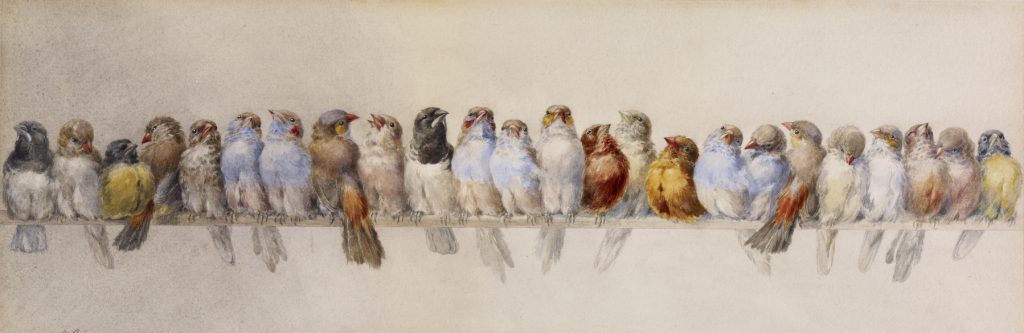 Para comenzar, realizada con un nivel de detalle deslumbrante, Una Percha de Pájaros es una obra hecha a finales del siglo XIX, en Francia, con la técnica de acuarela y grafito sobre papel. En ese sentido, las dos técnicas distintas de este trabajo le permitieron al acuarelista crear una obra de arte con tintes científicos realmente maravillosa. Por un lado, la utilización de grafito en la obra le permitió al artista tener un boceto o sketch sobre lo que quería representar. Particularmente, la delicada forma de las siluetas de las aves y de la base en la que se sostienen están hechas con un grafito fino que permite delimitar espacios, plasmar y pensar toda una composición antes de empezar a utilizar el medio acuoso. Por otro lado, la acuarela en esta obra no solo le aporta vida a las aves representadas a través de los diferentes colores que las componen, sino que también permite alcanzar un nivel de detalle en cada una de las partes de papel haciendo que el trabajo tenga un aura de precisión y veracidad.