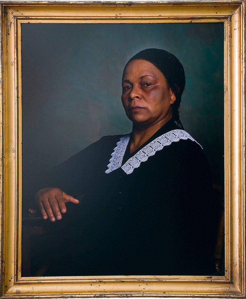 ¿Quiénes son los protagonistas del retrato? Esta es la primera pregunta que surge cuando se encuentra esta obra de Libia Posada, puesta intencionadamente al lado de un retrato del siglo XIX del político y empresario Agustín Nieto Barragán de Epifanio Garay en el Museo Nacional de Colombia (Imagen 1). A primera vista, la diferencia entre los sujetos de ambas piezas es evidente en cuestiones de género y raza, por lo que se esperaría que hubiera una gran discrepancia en la manera en la que son representados. Por el contrario, la protagonista de la obra de Posada está retratada en una posición que emana seguridad, presencia y poder, todo lo contrario de lo que se supondría de una mujer negra (una condición que la pone como un sujeto doblemente marginado históricamente). Vista aún más de cerca, se nota que la obra no es una pintura, sino que se trata de una fotografía de una mujer maltratada, tal como lo indica el hematoma en su pómulo izquierdo. Si de por sí la obra es muy impresionante desde un inicio, la representación de la violencia doméstica lleva al espectador a un nuevo nivel de reflexión y análisis. ¿Por qué representar la violencia? Más bien, ¿por qué recurrir al género del retrato[1] para representar la violencia de género? ¿Por qué no usar otro género artístico? Por este motivo, el siguiente texto pretende indagar y analizar la relación entre Ángel en casa No.3 de la serie Evidencia clínica II: Re-tratos (2007) y el retrato. De esta manera, se busca argumentar que, a partir de la apropiación del género y de sus características principales, la artista antioqueña denuncia una realidad social que históricamente ha afligido a varias mujeres.