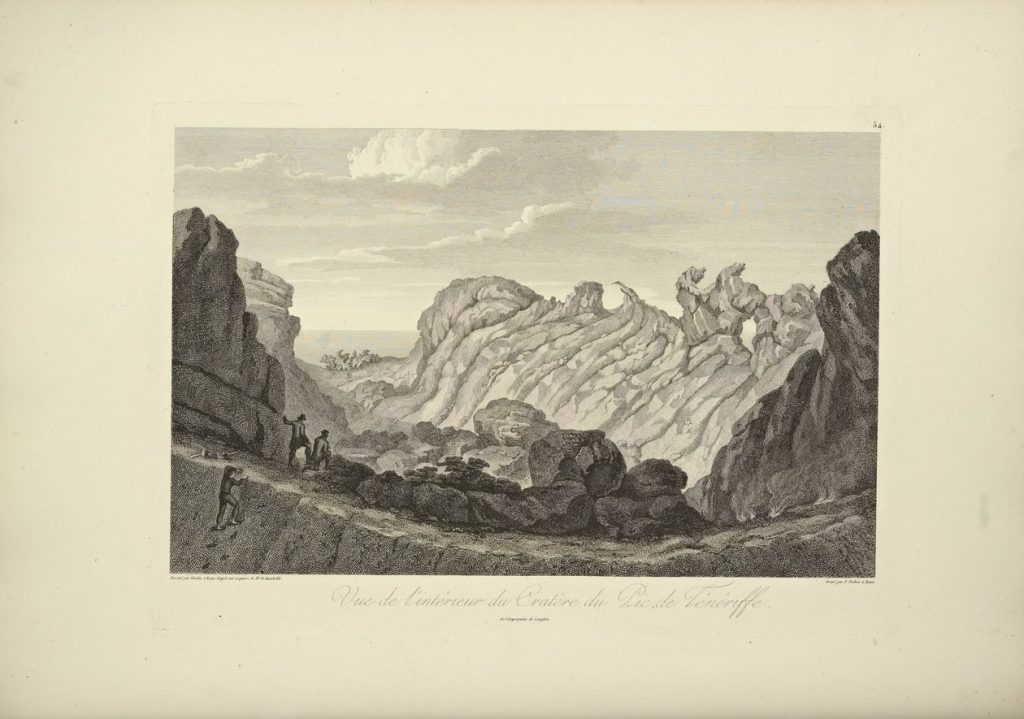 [9] Descripción original de la Plancha LIV: “Como las Vistas de las Cordilleras forman al mismo tiempo el Atlas Pintoresco de la Relation du voyage aux Tropiques, hemos pensado añadir esta lámina, aunque no tenga nada que ver con el nuevo continente. Muestra la cumbre del Pitón o Pan de Azúcar, que contiene la Caldera del Pico de Tenerife. Muestra la ladera rápida del cono cubierta de ceniza volcánica, una pared circulatoria de lava que rodea el cráter, que ahora no es más que un sulfatar, y una gran brecha en esta pared hacia el oeste. Yo había esbozado este dibujo desde un punto de vista puramente geológico; las lavas litoidales, carcomidas por la acción constante de los vapores de ácido sulfuroso, se superponen en capas, como los bancos que se encuentran en las montañas de formación secundaria. Estas capas, similares a las que se observan en el borde del antiguo cráter del Vesubio en La Somma, parecen ser el resultado de vertidos sucesivos. Están formadas por lava vitrificada, pórfido con base de obsidiana y pechstein. Durante siglos, el Pic de Ténériffe, cuya altura perpendicular es de más de mil novecientos toesas, sólo ha entrado en erupción lateralmente. La última de estas erupciones fue la de Chahorra en 1798. Al ver la enorme masa de deyecciones del Pico en la llanura de Spartium nubigenum, uno se asombra de la pequeñez del cráter del que se supone que salieron tantas cenizas, piedra pómez y bloques de vidrio volcánico; pero el señor Cordier, que de todos los mineralogistas es el que más tiempo ha pasado en la isla de Tenerife, ha hecho la importante observación de que el cráter actual, la Caldera du Piton, no es la abertura principal del volcán. Este erudito viajero encontró un embudo de enormes dimensiones en la ladera norte del Pico, que parece haber desempeñado el papel principal en las antiguas erupciones del volcán de Tenerife”, p. 293.