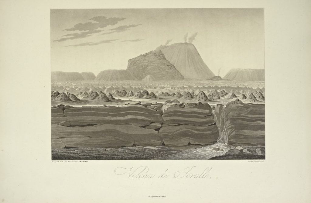 En suma, este contexto y aproximación a la naturaleza es lo que se ve reflejado en sus descripciones cuando habla de los volcanes. La descripción de estos accidentes geográficos como grandes escenarios de la naturaleza es sumamente minuciosa frente a las mediciones y explicaciones, pero haciendo un gran énfasis en aquello que Humboldt experimentó, aquello que vivió que le hizo sentir que el volcán observado era un marco fascinante de un fenómeno de la Tierra. Por ejemplo, al hablar del Volcán de Jorullo [Fig. 1] hace la siguiente observación: