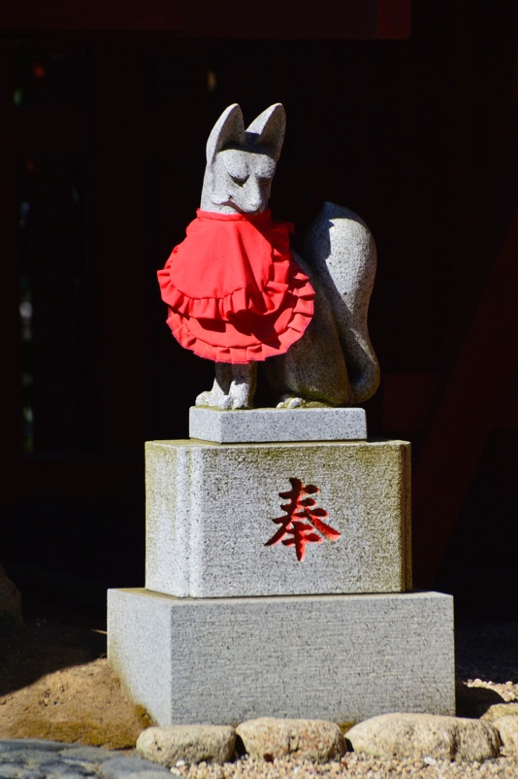 Imagen 1: Estatua de un zorro Inari en el santua-rio Sasuke Inari de Kamakura portando un babero rojo. Archivo personal.