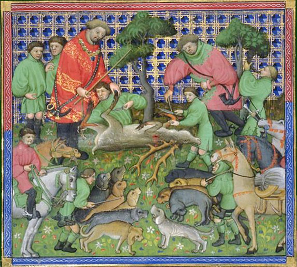 El libro de caza de Gastón Phoebus, dictado a un escriba entre 1387 y 1389, e ilustrado en diferentes talleres de Francia, ofrece al lector un práctico manual sobre cacería de diferentes animales presentes en los bosques europeos del siglo catorce. La ilustración (Fig. 1), representa el momento posterior a la caza del venado (conocido en francés como la curée) en el que, tradicionalmente, se les ofrecía a los perros ciertos trozos de la presa como recompensa por una hazaña exitosa. Los sirvientes, de evidente menor tamaño que los nobles, son los encargados de desollar el animal ante una expectante jauría de caza. El más grande de los personajes, que luce un elegante traje rojo y dorado, es el autor de la obra, Gastón Phoebus, también conocido como el conde de Foix, y es quien parece dirigir el ritual de desollamiento. Su mano levanta la pierna trasera del animal, pero son los sirvientes quienes se encargan del carneo. La escena se desarrolla en aparente calma y sosiego.